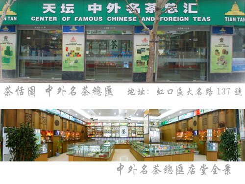 坐落于上海北外滩外白渡桥堍的中外名茶总汇,是沪上具有规模的专业茶叶零售批发销售商店,被上海市茶叶行业协会评为茶叶消费放心店,同时是上海市茶叶行业协会指定茶叶质量安全咨询点。当自动门把你迎进店堂的那一刻起,你仿佛置身于一座茶文化的艺术殿堂之中。首先映入你视野之中的是由在沪上享有盛誉的设计大师张忠飞先生题写制作的“茶”字墨宝,这是一件在沪上绝无仅有的全部用茶叶经过精细加工后镶嵌而成的书法作品,是将中华书法艺术与中华茶文化完美结合的一件不可多得的茶文化艺术品。