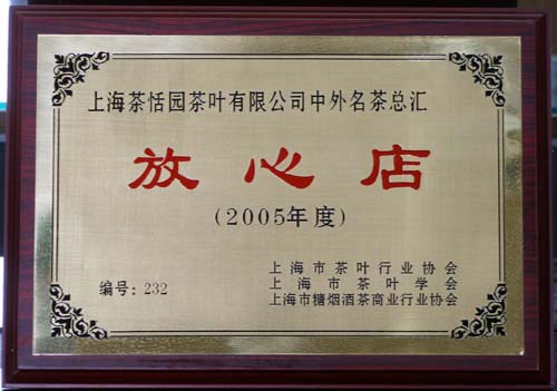 上海是一个茶叶消费的大都市,茶叶是否正宗,质量是否可靠,价格是否准确,历来是市民十分关心的问题。为推动茶叶专业店、柜的诚信服务,创造和谐有序的消费环境,经上海市茶叶行业协会、茶叶学会、糖烟酒茶商业行业协会联合对沪上多家茶叶店、柜进行专项检查评分,并最终授予42家茶叶专业商店、专柜“2005年度放心店”称号,我公司中外名茶总汇名列其中,获得此项荣誉。