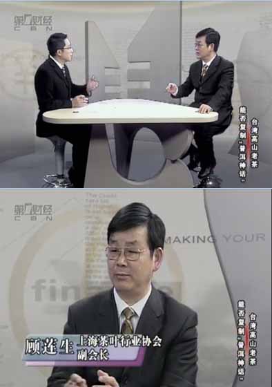 上海茶恬园茶叶有限公司总经理,上海茶叶行业协会副会长顾莲生,作为嘉宾应邀参加上海第一财经《理财宝典》节目。图为与主持人李欣探讨台湾高山老茶如何复制普洱神话。